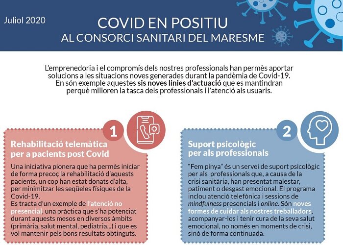 - Rehabilitació telemàtica per a pacients post Covid: Una iniciativa pionera que ha permès iniciar de forma precoç la rehabilitació d'aquests pacients, un cop han estat donats d'alta, per minimitzar les seqüeles físiques de la Covid-19. Es tracta d'un exemple de l'atenció no presencial, una pràctica que s'ha potenciat durant aquests mesos en diversos àmbits (primària, salut mental, pediatria...) i que es vol mantenir pels bons resultats obtinguts.