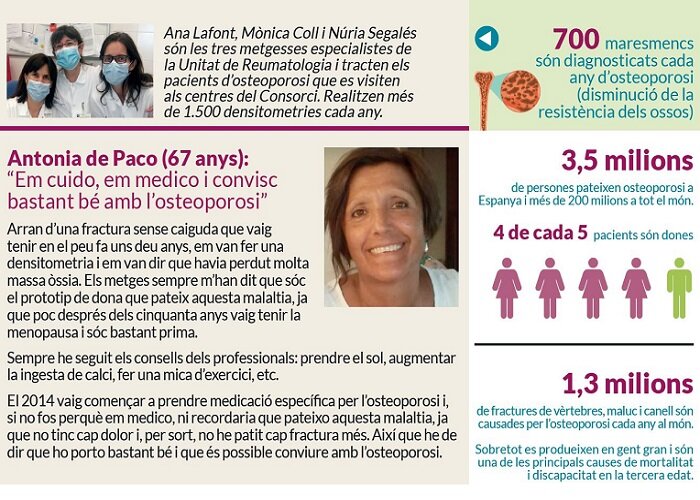 L'osteoporosi es caracteritza per una disminució del teixit ossi, que fa que augmenti la fragilitat dels ossos i la possibilitat de patir fractures. És una malaltia crònica que pateixen 3,5 milions de persones a Espanya i més de 200 milions a tot el món, i que afecta majoritàriament a les dones postmenopàusiques (4 de cada 5 pacients és dona). La Unitat de Reumatologia del Consorci Sanitari del Maresme realitza més de 1.500 densitometries cada any i diagnostica anualment uns 700 pacients amb aquesta malaltia.