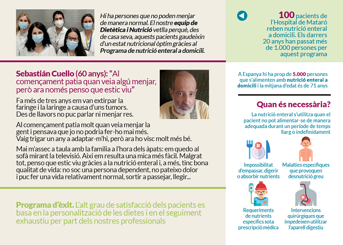 Son persones que no poden menjar de manera normal i l'equip de Dietètica i Nutrició vetlla perquè, des de casa seva, aquests pacients gaudeixin d'un estat nutricional òptim. Actualment, uns 100 pacients reben nutrició enteral a domicili i, els darrers 20 anys, han passat més de 1.000 persones per aquest programa.