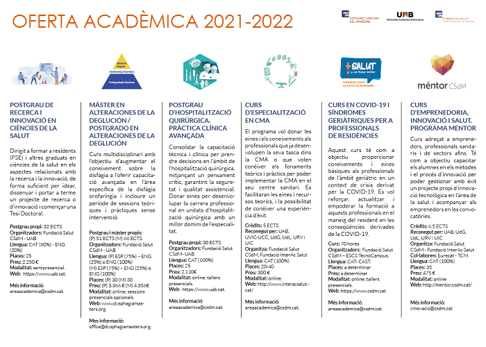 A més, es reediten el Postgrau de Recerca i Innovació en Ciències de la Salut i el Curs d'Emprenedoria. Innovació i Salut - Programa Méntor (tots dos totalment gratuïts per als professionals del Consorci), a més del Postgrau i Màster en alteracions de la deglució, d'abast internacional. Podeu consultar l'oferta acadèmica global al document adjunt, i els detalls de cada curs fent clic aquí.