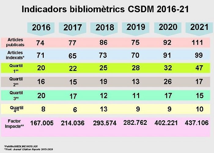 La memòria científica del 2021 recull els abstracts de tots els articles científics amb autors de casa nostra que es van publicar l'any passat. D'aquests, 99 han estat publicats en revistes indexades en, almenys, una de les quatre bases de dades següents: PubMed, Medline, WOS i JCR. El 2020 se'n van publicar un total de 92 articles, 91 dels quals en revistes indexades.