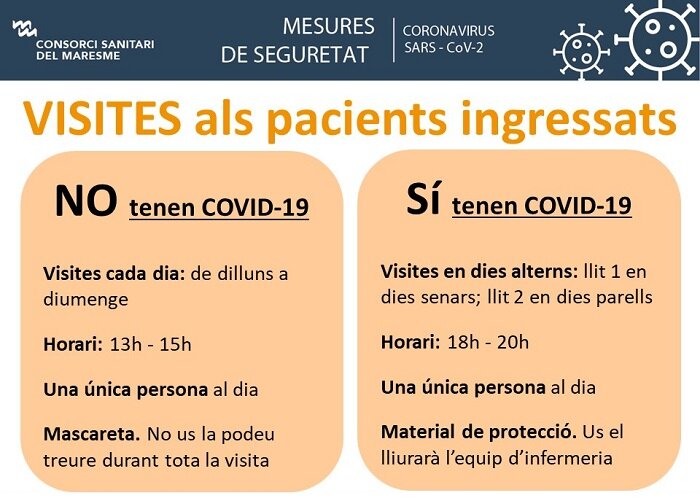 Per tal de preservar la seguretat i evitar possibles contagis, les visites estaran limitades a una visita diària per pacient, dins dels horaris establerts.