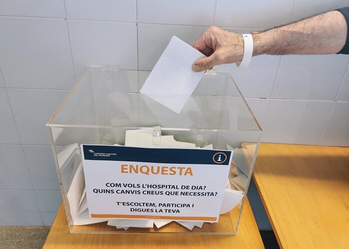Sota el lema "Com t'agradaria el nou Hospital de Dia Oncològic: ajuda'ns a millorar-lo!" estem fent una enquesta entre els pacients que actualment estan en tractament, per decidir part del disseny de l'espai -tipus de butaques, intensitat de la llum, espais individuals i comuns... - així com dels elements que poden ajudar a fer més còmoda la seva estada -televisions individuals amb auriculars, plantes i vegetació, llibres...-.