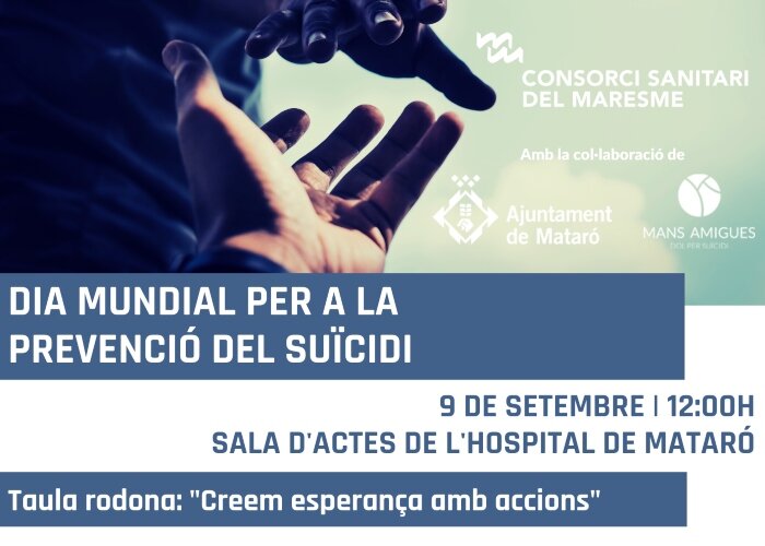 Us recordem que el Consorci, en col·laboració amb l'associació mataronina Mans Amigues i l'Ajuntament de Mataró, organitza una taula rodona el pròxim divendres 9 de setembre per commemorar el Dia Mundial per a la Prevenció del Suïcidi. L'acte, que està obert a tothom interessat a contribuir en la prevenció d'aquest fenomen (sanitaris, docents i ciutadania en general), tindrà lloc a les 12h a la Sala d'Actes de l'Hospital de Mataró.