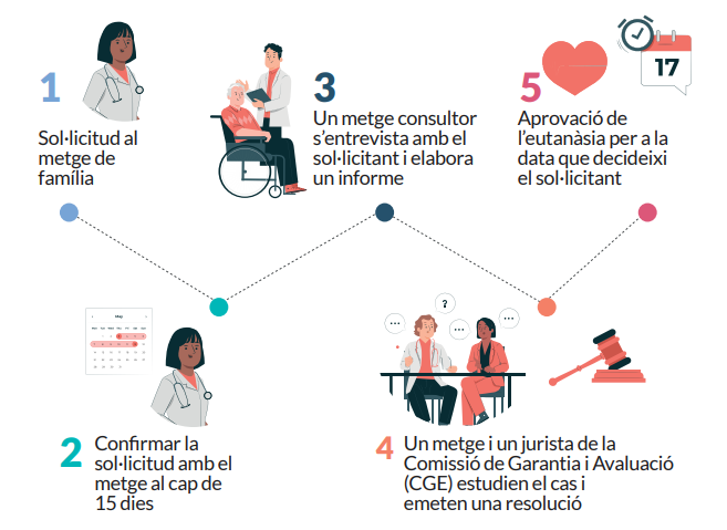 Qui pot sol·licitar-la. L'eutanàsia sempre l'ha de sol·licitar la persona interessada, que ha de complir uns criteris específics: tenir un patiment físic o psíquic constant o intolerable a causa d'una malaltia terminal o un patiment crònic greu i impossibilitant. Si el pacient no la pot demanar, però consta en el document de voluntats anticipades, també la poden sol·licitar els seus familiars.