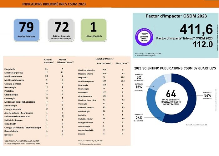 Aquestes són dades provisionals facilitades des de la Biblioteca del Consorci, que ha elaborat el document Publicacions Científiques CSdM 2023 que recull tots els abstracts dels articles científics amb autors de casa nostra que es van publicar l'any passat amb els següents indicadors bibliomètrics: factor d'impacte, quartil, categoria i posició de la revista. Podeu consultar aquest document en l'enllaç adjunt a la notícia.