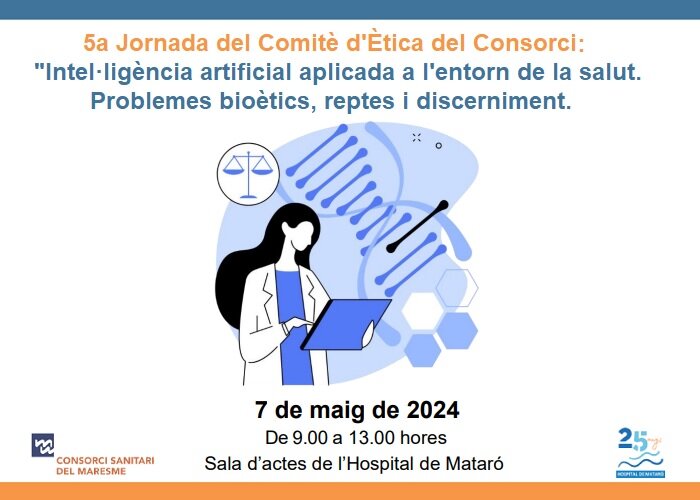 "Reptes ètics de l'aplicació clínica de la intel·ligència artificial" serà la conferència inaugural de la 5a Jornada del comitè d’ètica assistencial del Consorci, que se celebra el 7 de maig al matí, a la Sala d’Actes de l’Hospital de Mataró. L’accés és lliure, amb inscripció prèvia, i està obert a la ciutadania i als professionals de tots els centres del Consorci.
