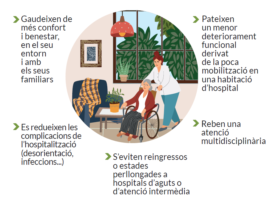 Tipus de pacients. Són, principalment, persones d'edat avançada amb fragilitat, multimorbiditat i situacions de cronicitat complexa. També aquelles amb dues o més síndromes geriàtriques o una d'elles de difícil maneig, així com pacients convalescents després d'una cirurgia o d'un problema mèdic. Els criteris d'inclusió a l'Hospital a Domicili d'Atenció Intermèdia (HaDAI) són els següents: