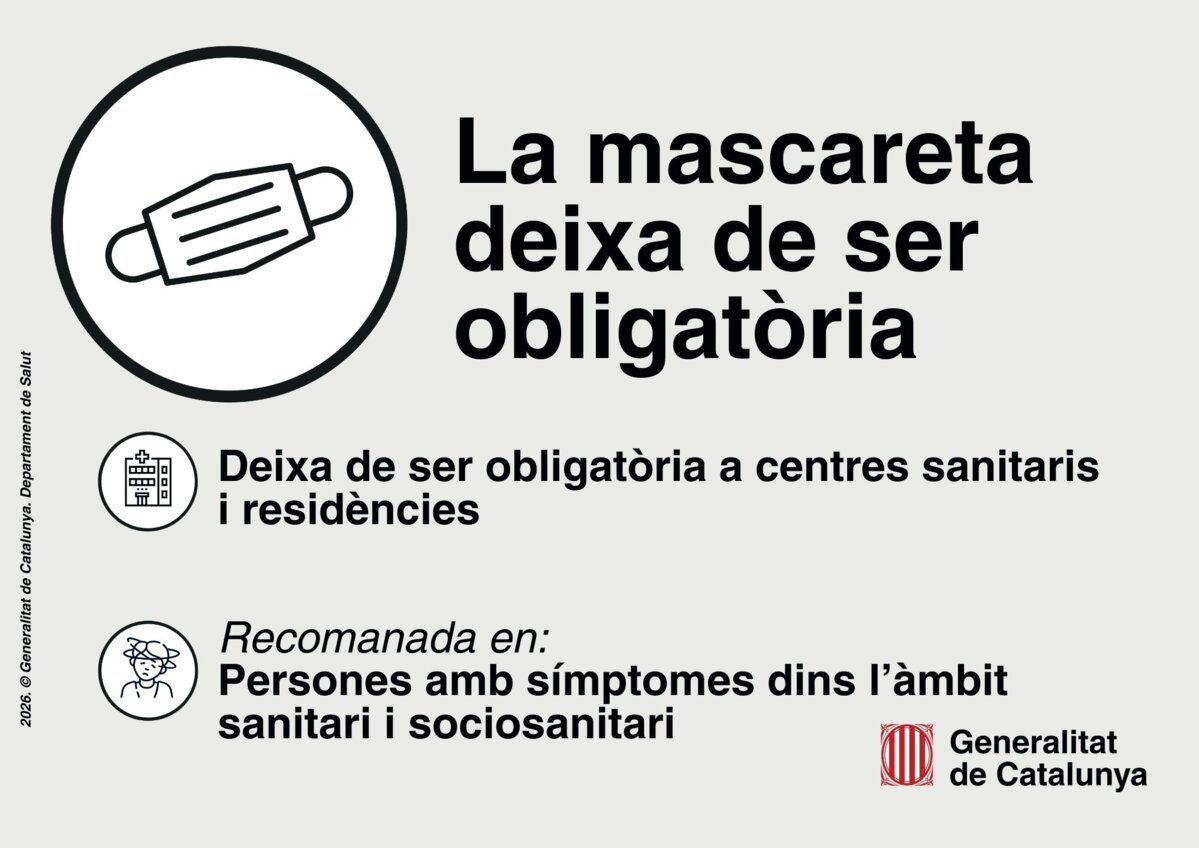 Els departaments de Salut i de Drets Socials i Inclusió han decidit no prorrogar l'obligatorietat de l'ús de la mascareta en centres i serveis sanitaris, així com en residències de gent gran i centres per a persones amb discapacitat. Per tant, la mascareta deixa de ser obligatòria a partir d'avui 7 de gener per la baixada en la incidència de les infeccions respiratòries.
