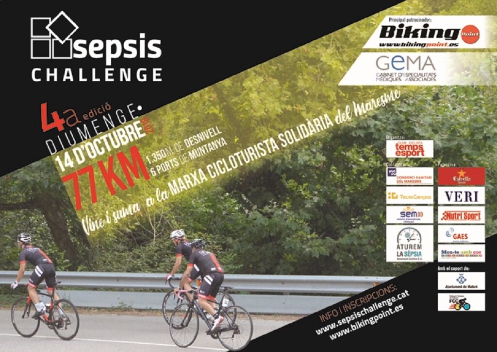 Sepsis Challenge 2018. El pròxim 14 d’octubre se celebrarà la 4a edició d’aquesta marxa cicloturista solidària que contribueix a la formació de professionals i a la investigació en sèpsia. La Sepsis Challenge, organitzada pel Club Ciclista Temps d’Esport, consta d’un recorregut de 77 km i 1.350 m de desnivell i forma part del programa “Mou-te amb el cor” de l’ajuntament de Mataró. Les inscripcions es poden fer aquí.