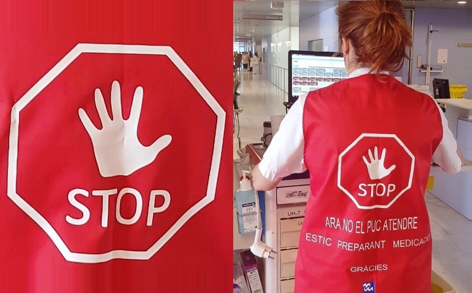 Un distintiu de seguretat. S’ha decidit provar aquesta actuació senzilla amb una armilla vermella amb la imatge d’un stop a l’esquena i amb un text que diu “ara no el puc atendre, estic preparant medicació” tot buscant promoure i millorar la seguretat dels pacients amb la conscienciació i la implicació tant dels pacients, acompanyants com dels mateixos professionals que han de tenir en compte la importància de respectar el temps de preparació i administració de la medicació.