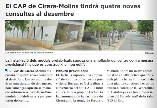 El CAP de Cirera-Molins tindrà quatre noves consultes al desembre